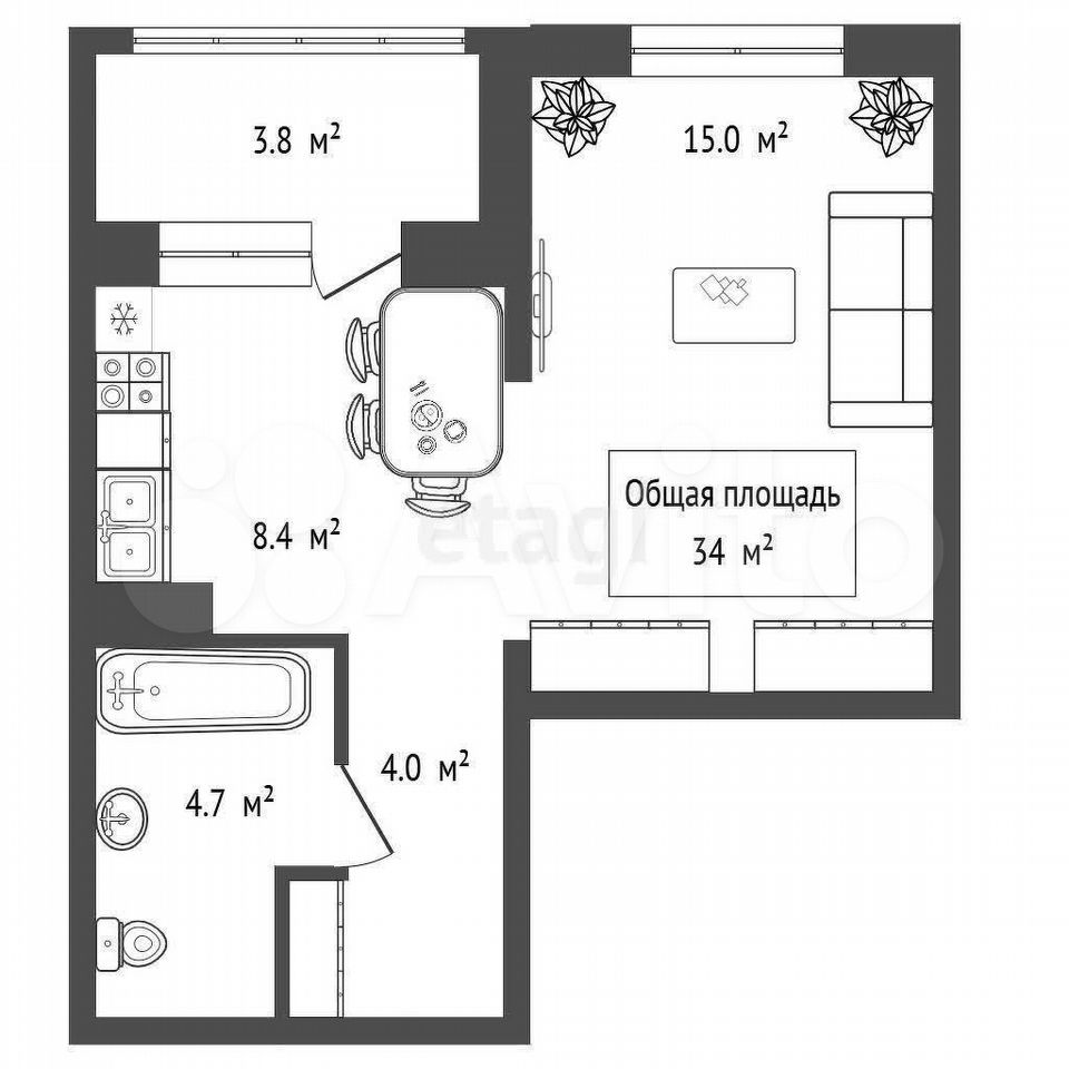 - Общая площадь: 34 м2