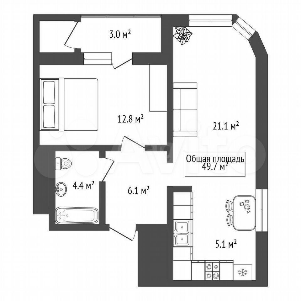 - Общая площадь 49.7 м2
