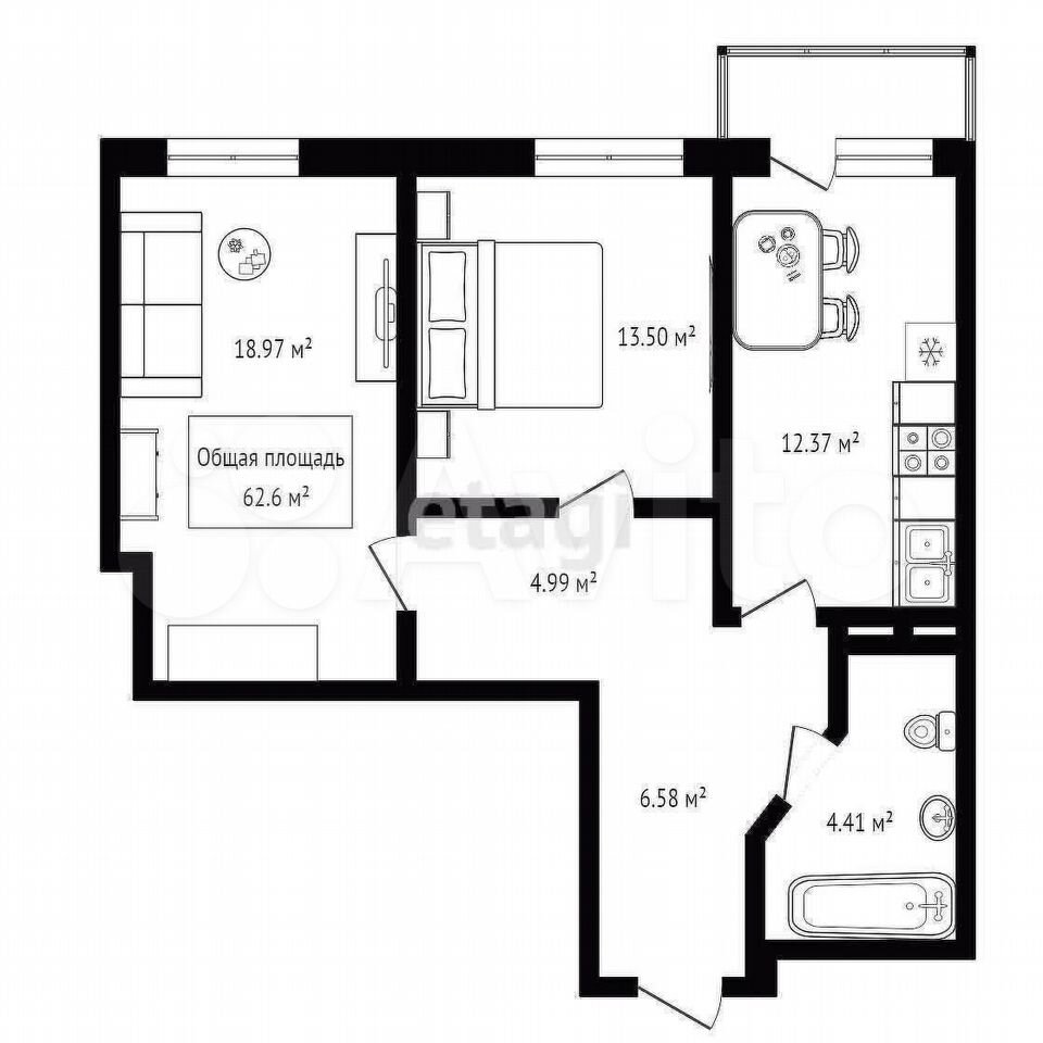 - Общая площадь: 62.6 м2