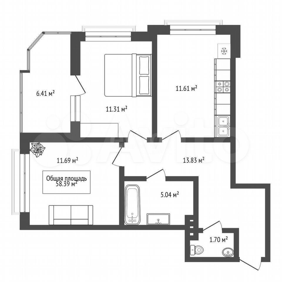 - Общая площадь: 58 м2
