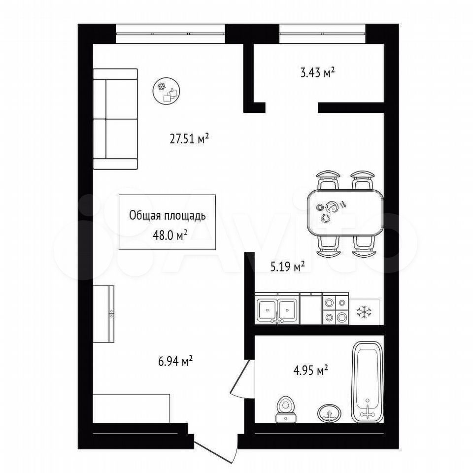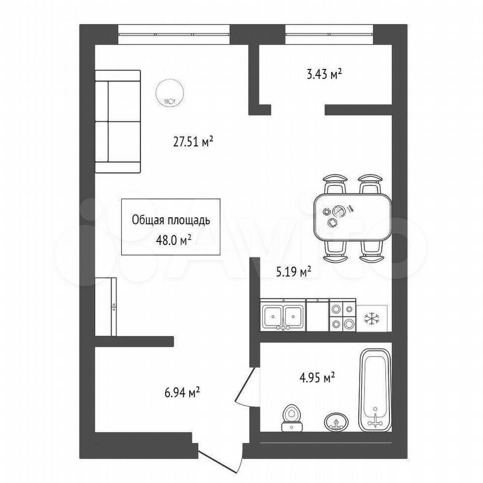 - Общая площадь: 48 м2