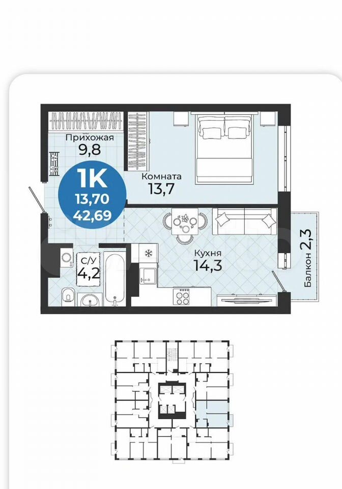 - Общая площадь 42.7 м2
