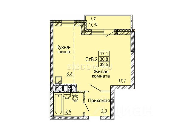 - Общая площадь 30.4 м2