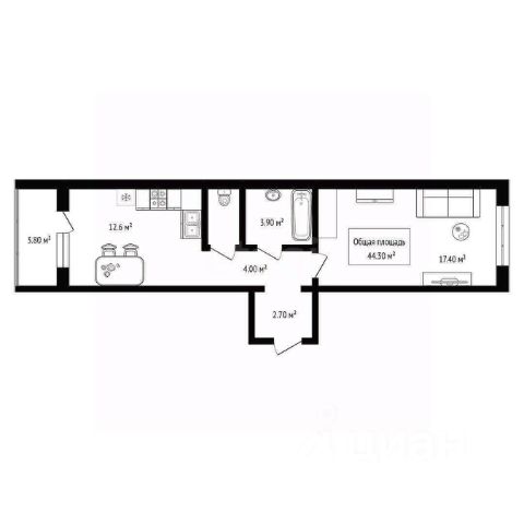 - Общая площадь: 42.5 м2