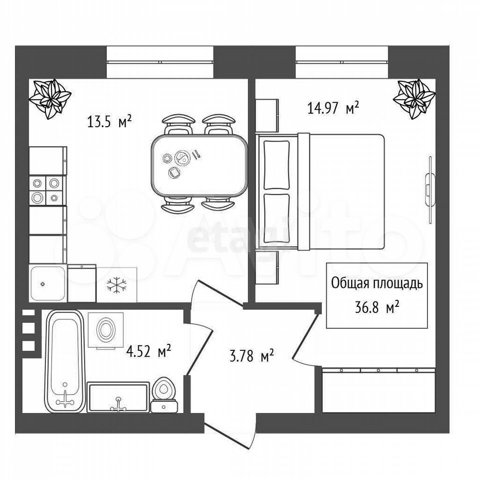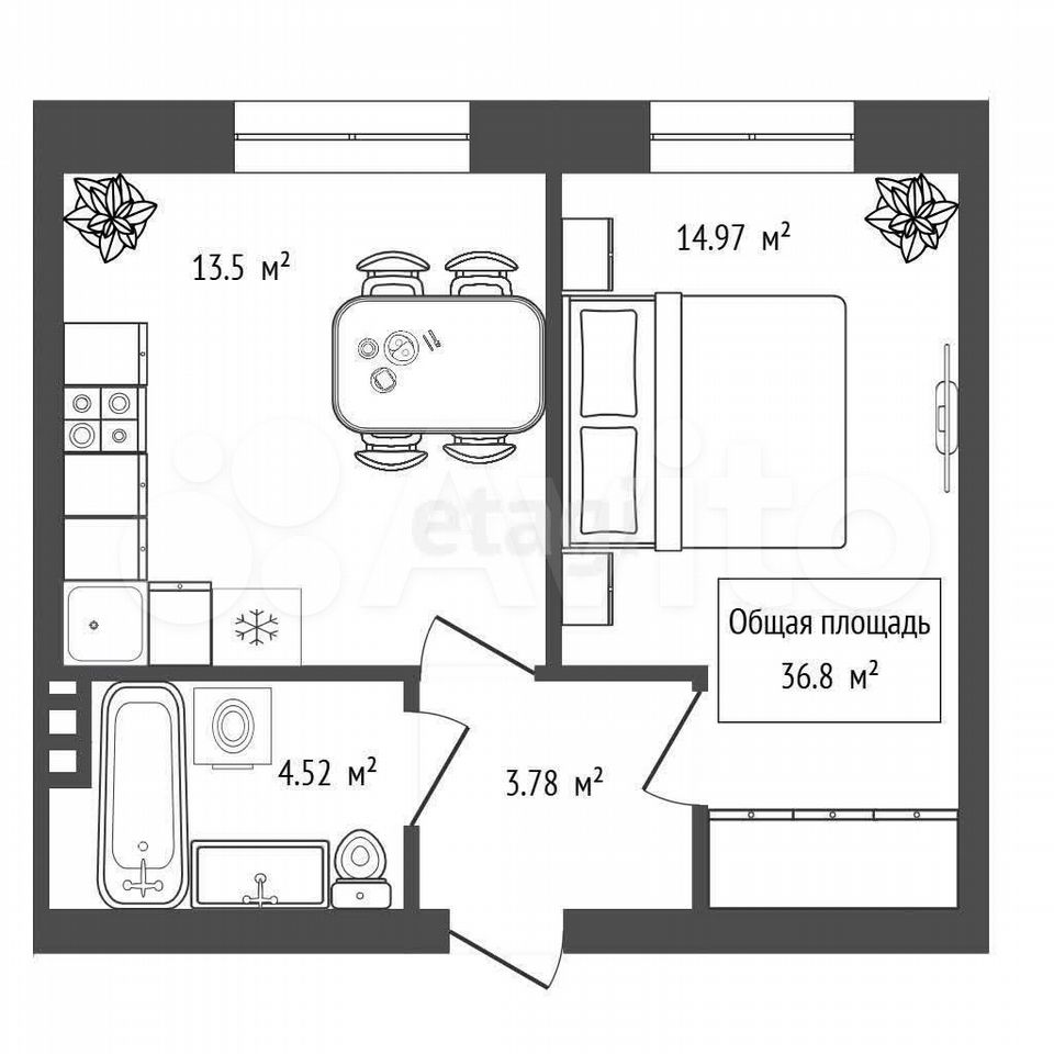 - Общая площадь: 36.8 м2