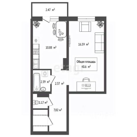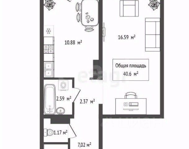 - Общая площадь 40.6 м2