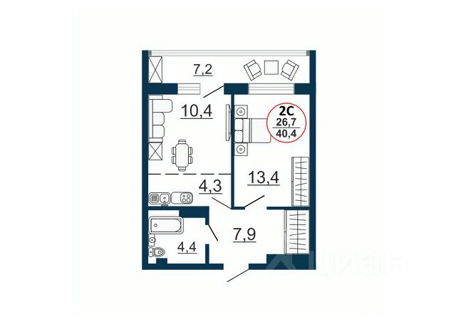 - Общая площадь: 40.5 м2