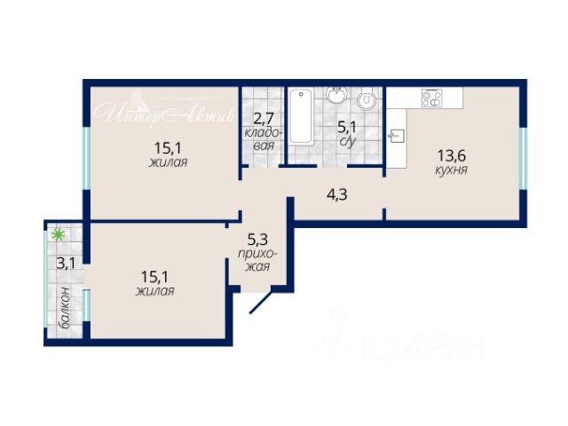 - Общая площадь: 61.5 м2