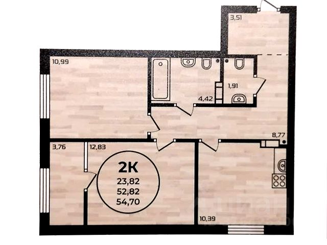 - Общая площадь 52.5 м2