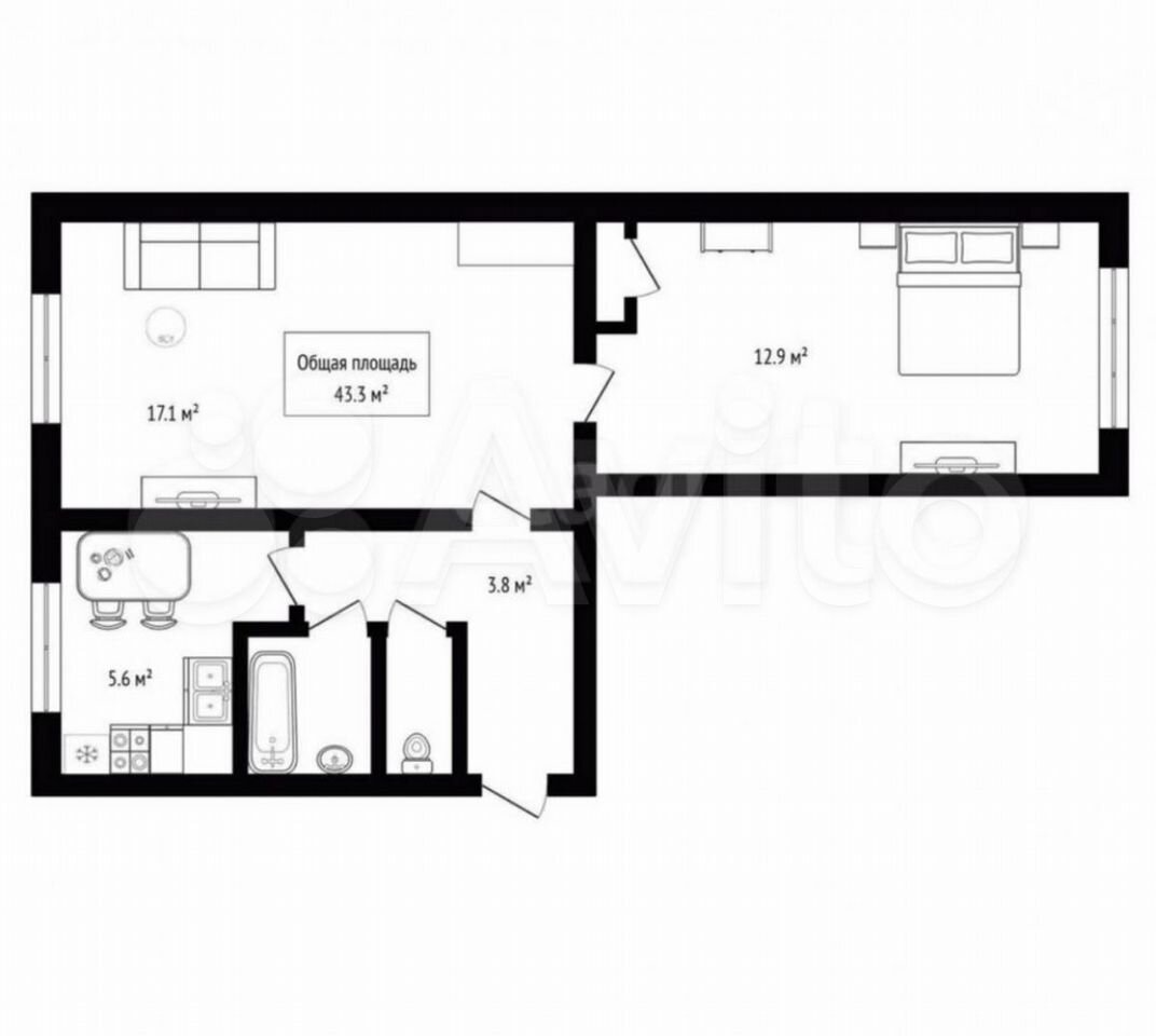- Общая площадь 43.3 м2
