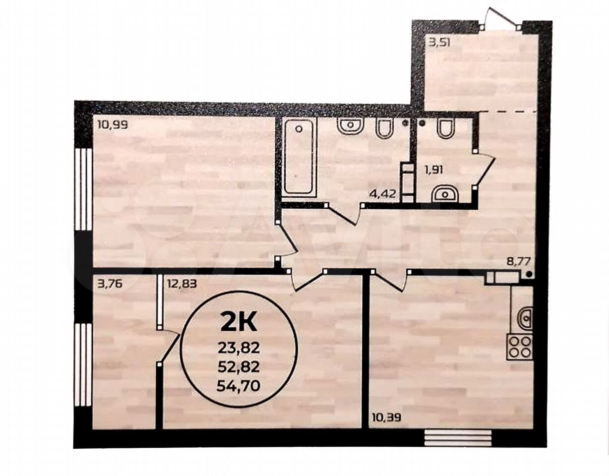 - Общая площадь: 52.5 м2