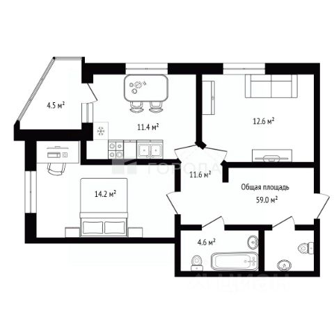 - Общая площадь 59 м2