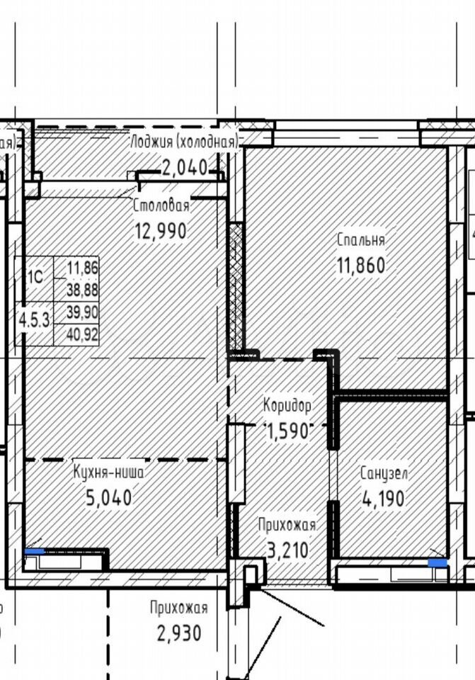 - Общая площадь 38.8 м2
