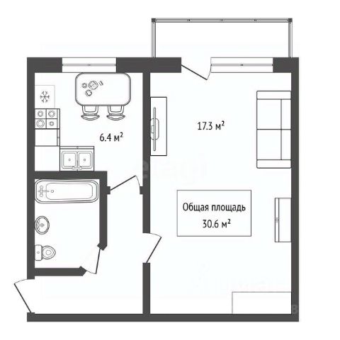 - Общая площадь 30.6 м2