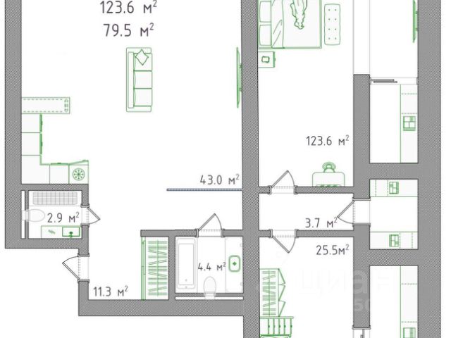 - Общая площадь 123.6 м2