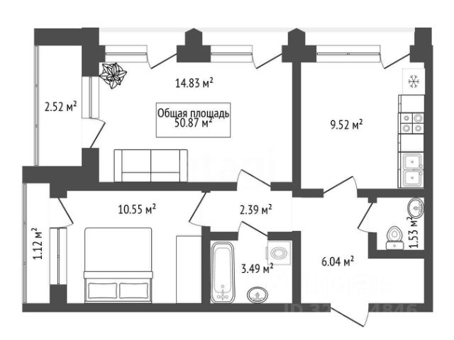 - Общая площадь: 50.8 м2