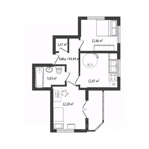 - Общая площадь: 54.4 м2