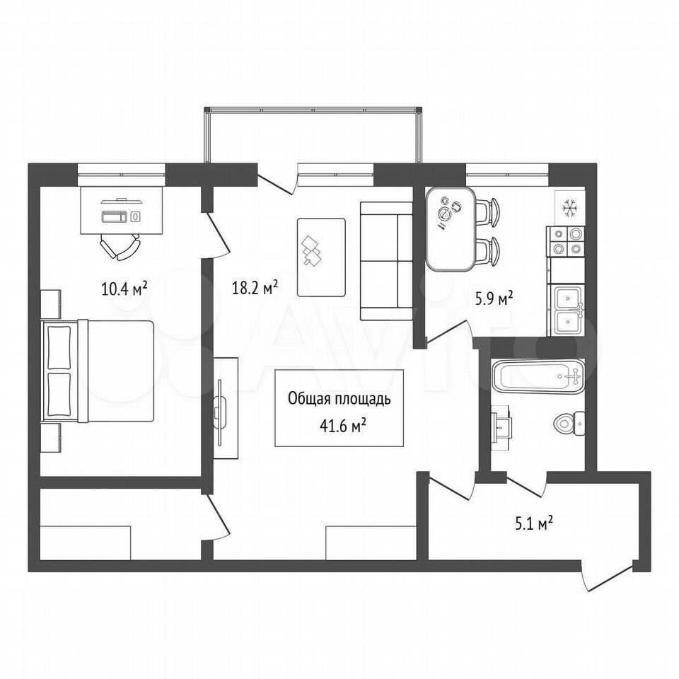 - Общая площадь: 41.6 м2