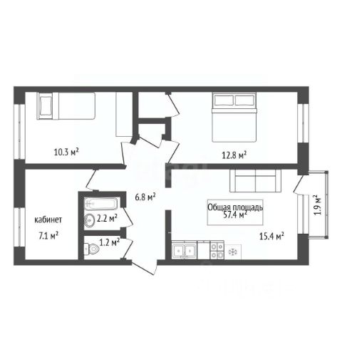 - Общая площадь: 57.4 м2