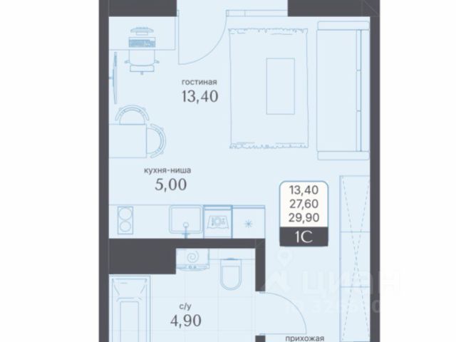 - Общая площадь 29.9 м2