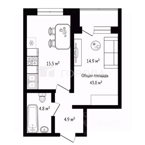 - Общая площадь 43 м2