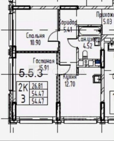 - Общая площадь: 54.5 м2