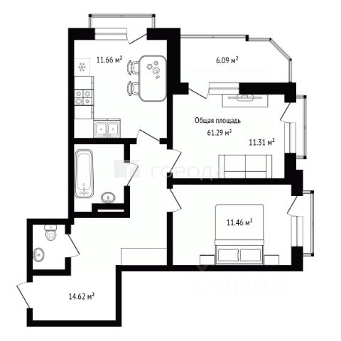 - Общая площадь 61.3 м2