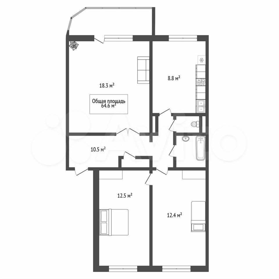 - Общая площадь: 64.6 м2