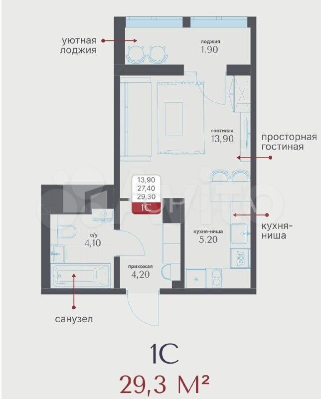 - Общая площадь 29 м2