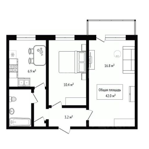 - Общая площадь 42 м2