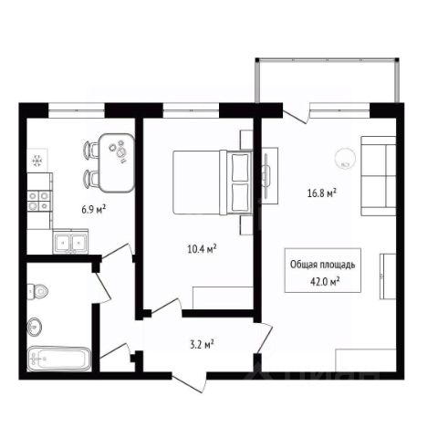 - Общая площадь: 42 м2