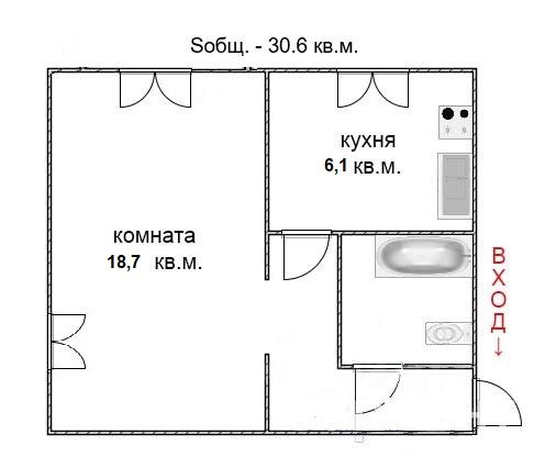 - Общая площадь 30.6 м2