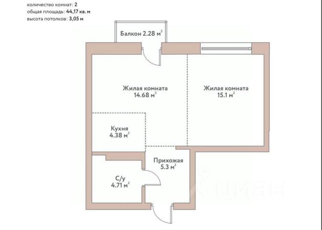 - Общая площадь: 44 м2