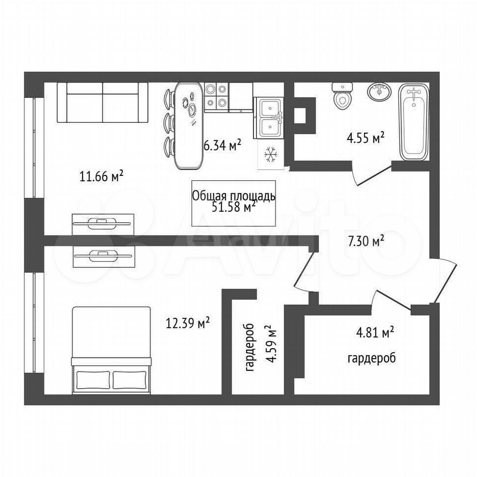 - Общая площадь 51.6 м2