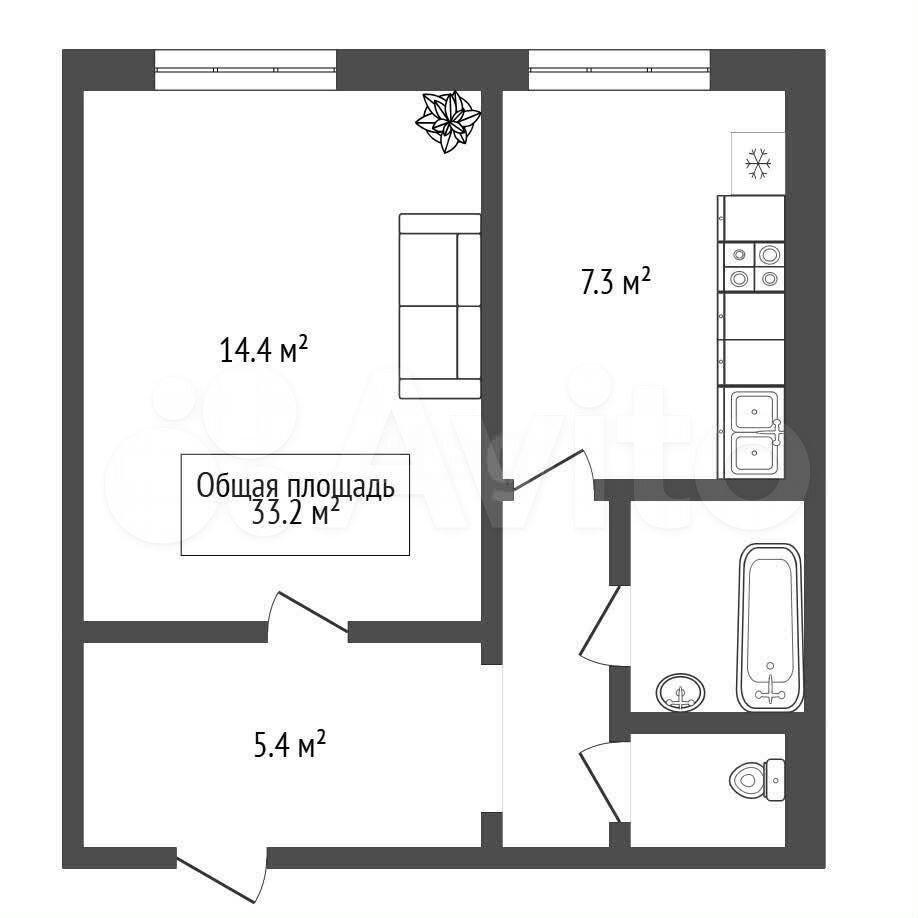 - Общая площадь 33.2 м2