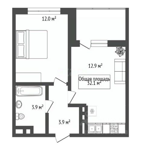 - Общая площадь 32.1 м2