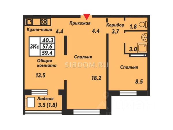 - Общая площадь: 59.4 м2