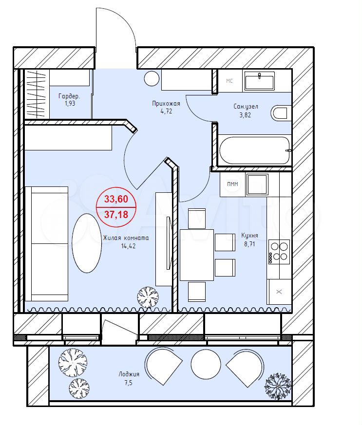 - Общая площадь 37.2 м2