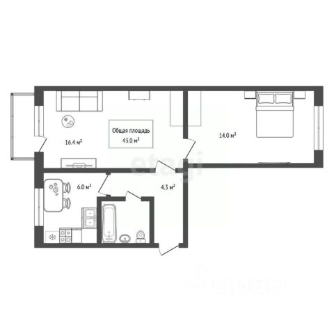 - Общая площадь: 43 м2