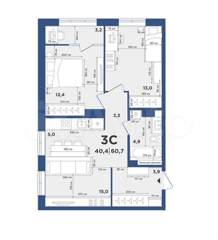 - Общая площадь: 60.7 м2