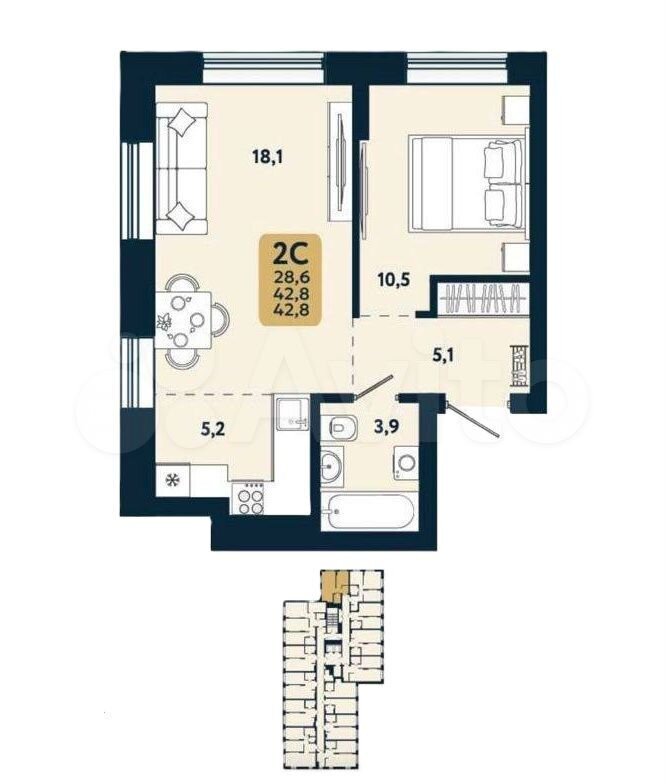 - Общая площадь 42.8 м2