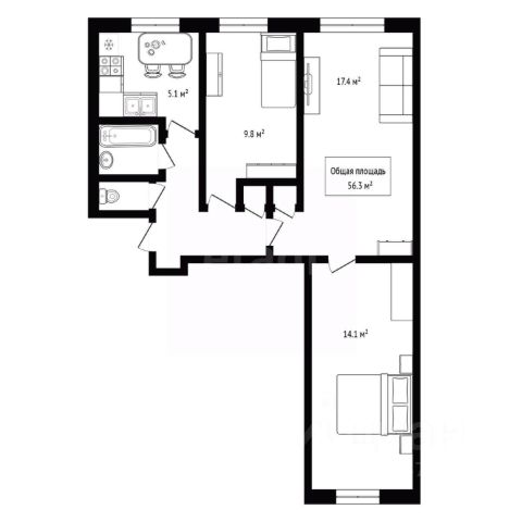 - Общая площадь: 56.3 м2
