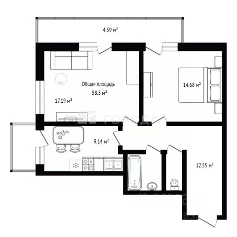 - Общая площадь 58.5 м2