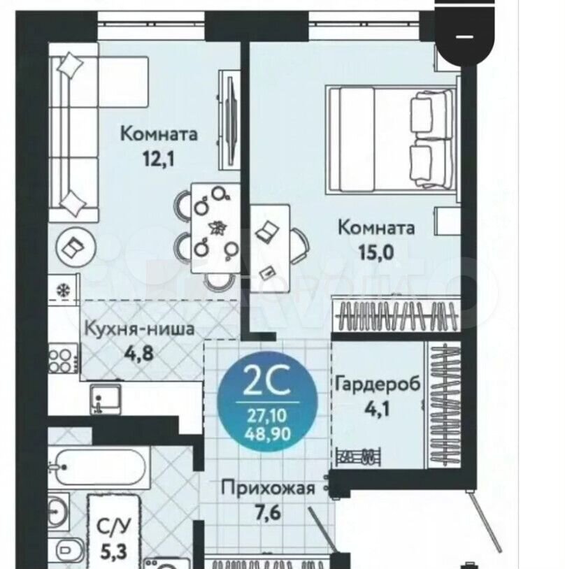 - Общая площадь: 48.9 м2