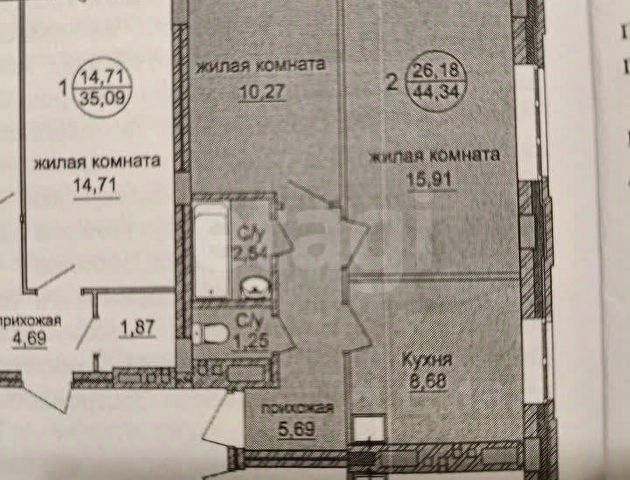 - Общая площадь: 44.3 м2