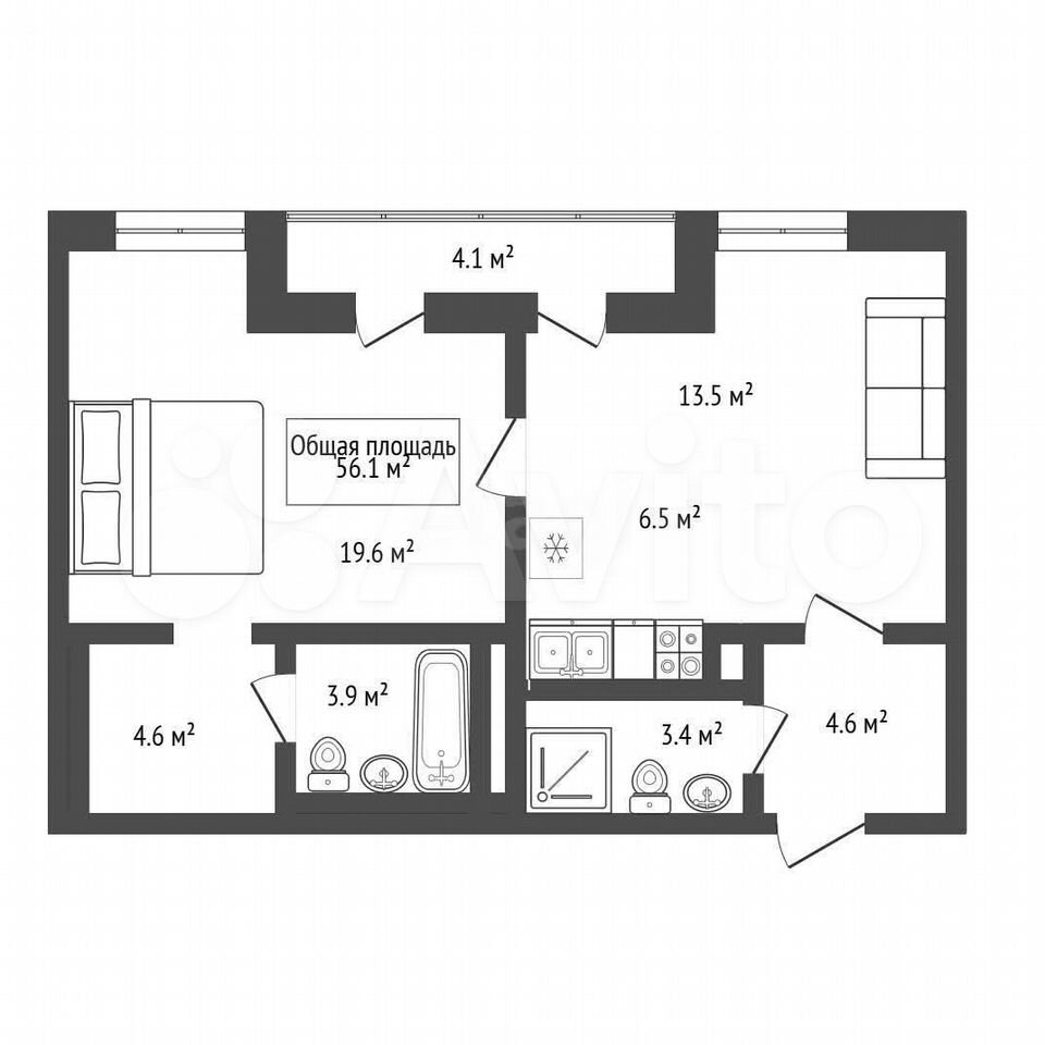 - Общая площадь: 56.1 м2
