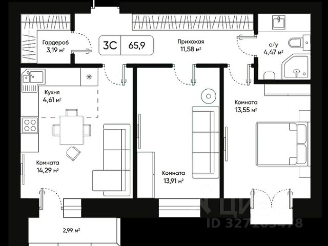 - Общая площадь: 65.9 м2