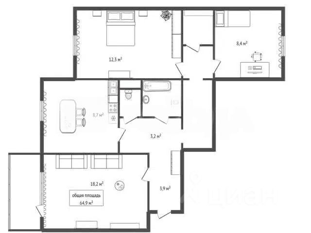 - Общая площадь: 64.9 м2