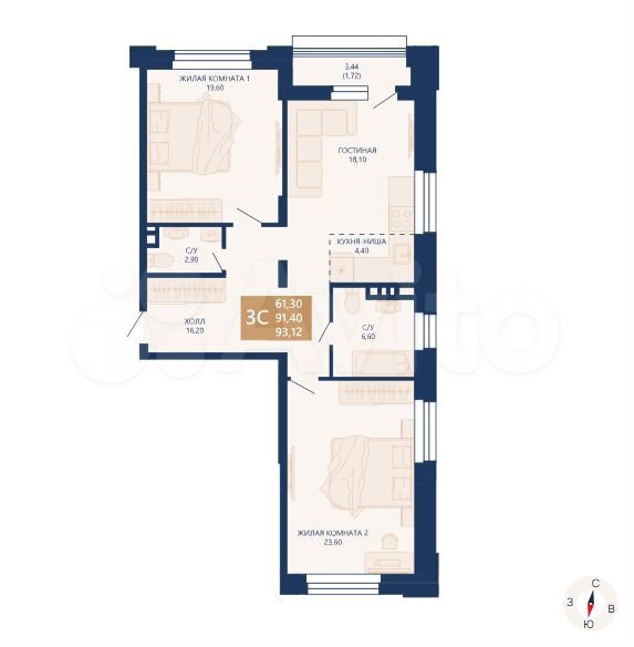 - Общая площадь: 93.1 м2