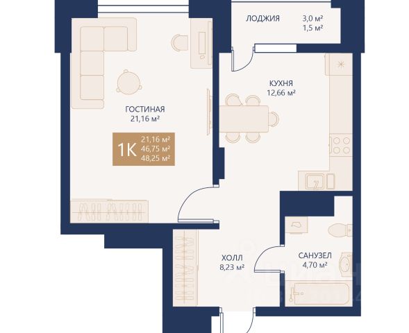 - Общая площадь: 49.8 м2